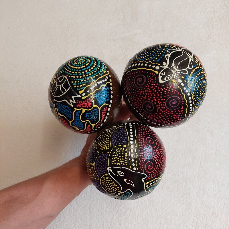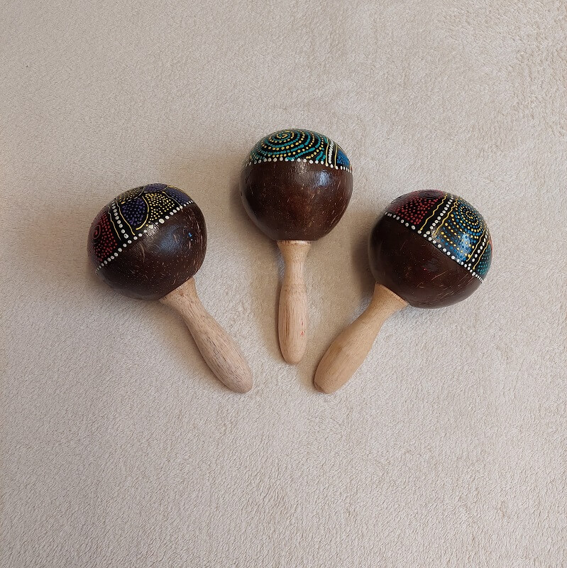 Rassel aus Kokosnuss gefertigt, mit Dotpainting- Malerei